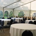 .... in einem abschüssigen Garten, es musste viel unterbaut werden. zudem lieferten wir im Zelt runde Tische mit 1,50 m Durchmesser und Polsterstühle.